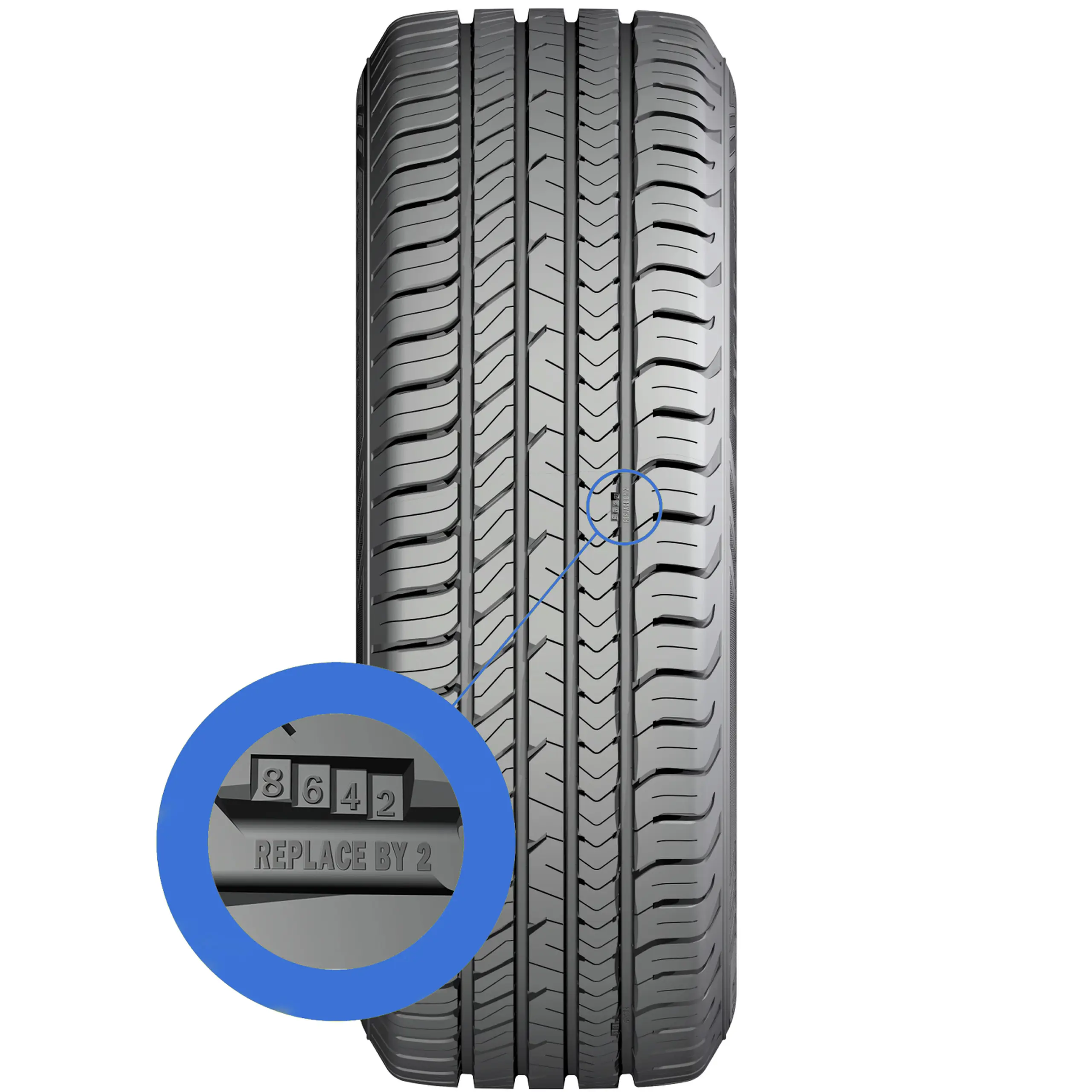 Cuenta con la más moderna y última tecnolgía de la marca estadounidense denominada “Wear Gauge”, desarrollada para que tú puedas seguir el nivel de profundidad de la banda de rodamiento de la llanta de forma sencilla e interactiva, los índices de desgaste se miden por los número 8-6-4 y 2, cuando el desgaste llegue a este último, sabrás que es hora de cambiar de rueda..